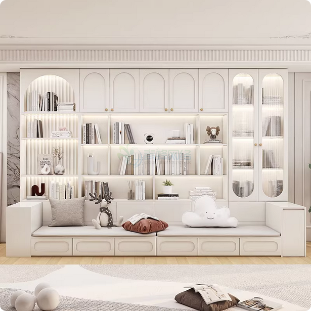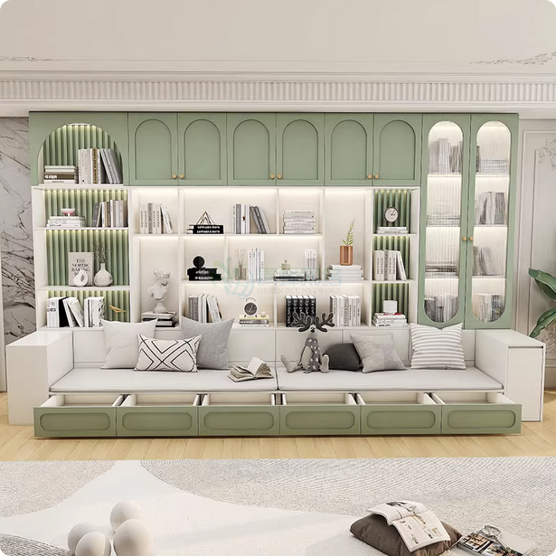 客厅沙发书柜储物柜一体满墙到顶定制美式实木书橱带卡座一体靠墙